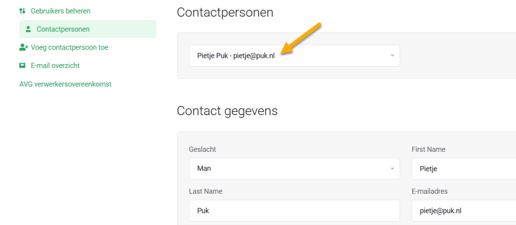 Hoe werkt het? De tijdelijke instructie wordt opgegeven per contactpersoon. Log in en ga in het dashboard direct naar de contactpersonen aan het linkerkant. Klik op de bovenste contactpersoon en als die zich opent kiest u via het grijze pijltje degene waarvoor u een tijdelijke instructie wil toepassen.