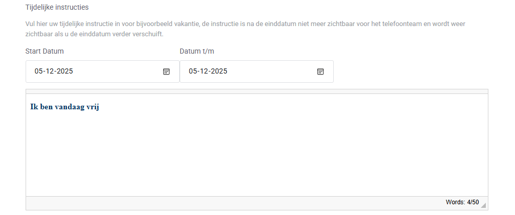 Deze tijdelijke instructie komt bij uw telefonistes in beeld op de door u aangegeven begindatum en verdwijnt uit beeld op de door u aangegeven einddatum. Geen misverstanden, geen extra werk, geen gepuzzel om de instructies kort te houden!